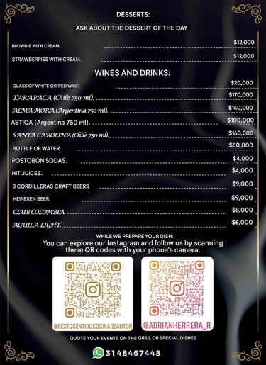 At Sexto Sentido, we fuse the tradition of Argentine barbecue with Colombian flavors, offering a unique gastronomic experience that awakens your senses through our grill, pasta, and fresh seafood.